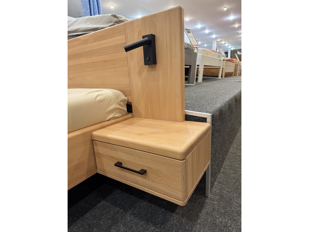 Dokonalá propracovanost masivního dřeva v síle 40 mm.Levý a pravý noční stolek svým zaoblením elegatně navazuje na čelo postele.