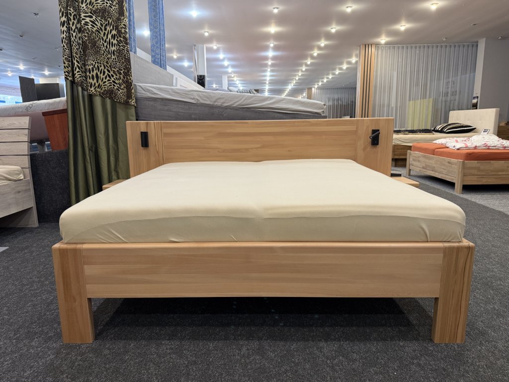 Postel z masivního bukového dřeva v síle 40mm. Rozměr 180x200 cm. Postel má rozšířené čelo na kterém jsou namontovány noční stolky a je osazena lampičkami.