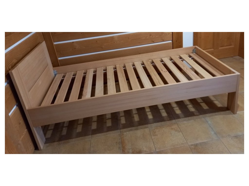 Uložení roštu je na latě našroubované na stranách bočnic. Sestavení postele je tak velice jednoduché, kdy bočnice postele nasadíte na kování na čelech postele a máte sestaveno. Do vnitřku postele uložíte na našroubované laťe prkenný rošt.